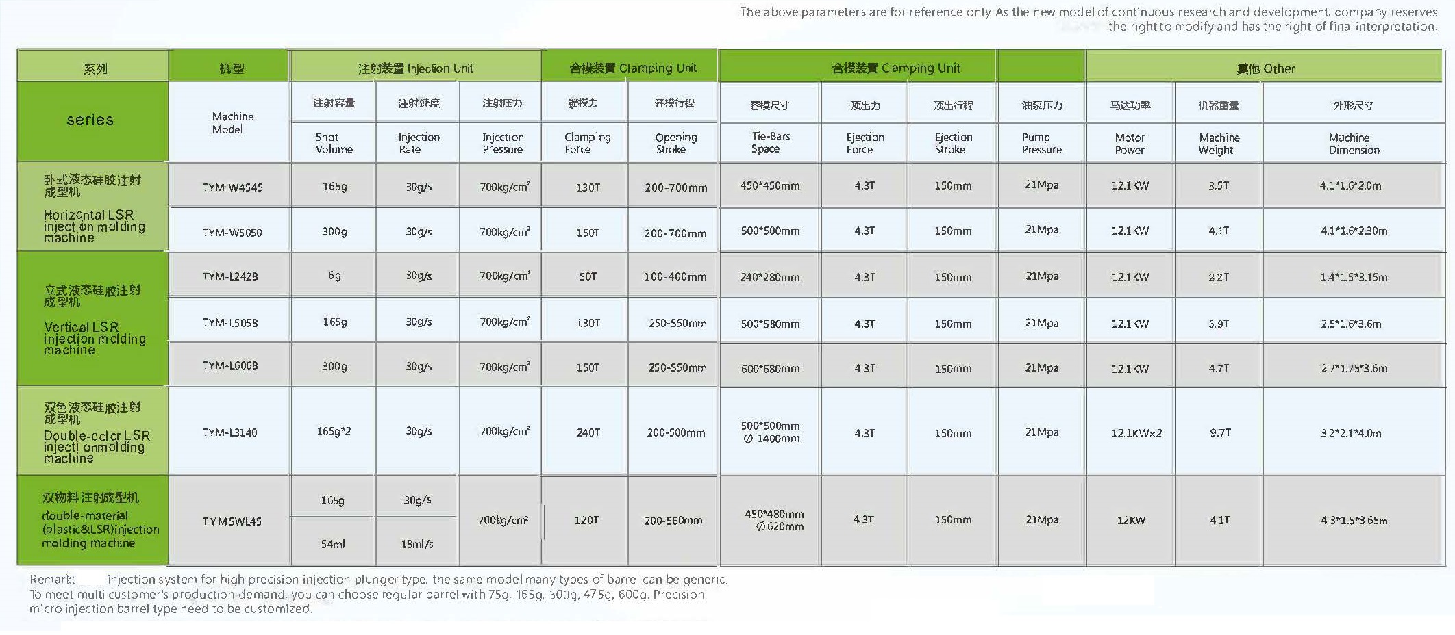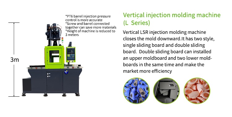 Direct pressure mould opening and closing system, horizontal injection structure, it can adjust the mould faster, and control the position more precisely. It is more suitable for producing the LSR parts which can be automatically removed from the mould.