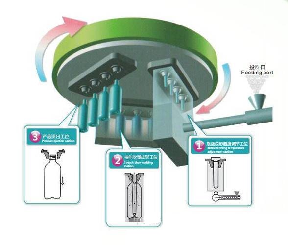 2. **Second Station:** The preform is rotated 90 degrees to the stretch and blow station, where it is blow molded into the container shape.