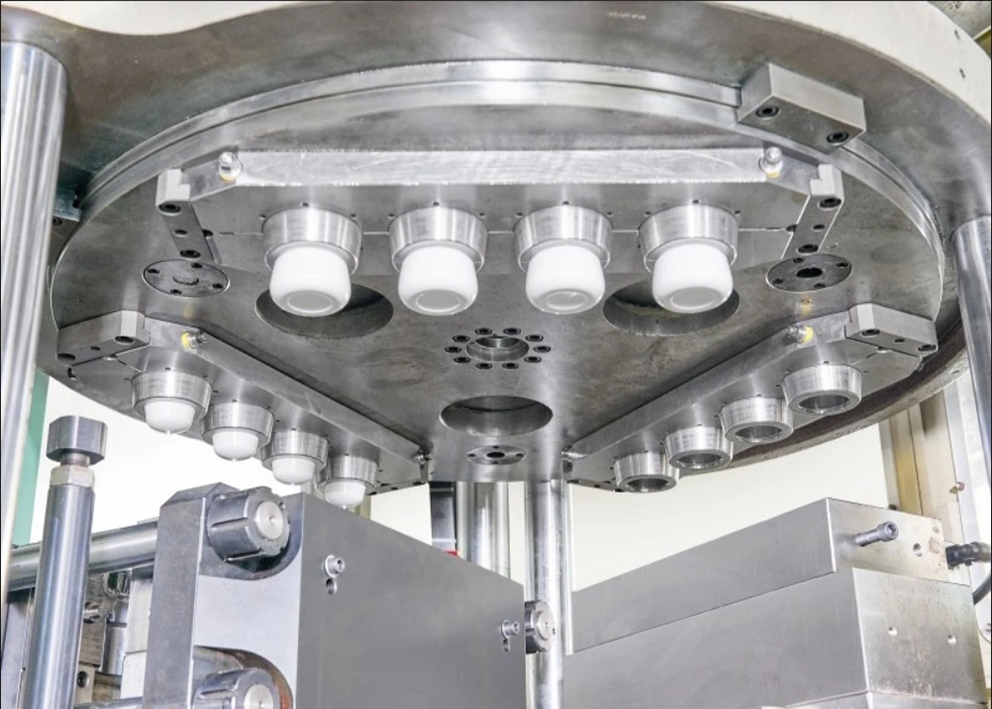 3. **Third Station:** A final rotation brings the completed containers to the ejection station, completing the production cycle efficiently.