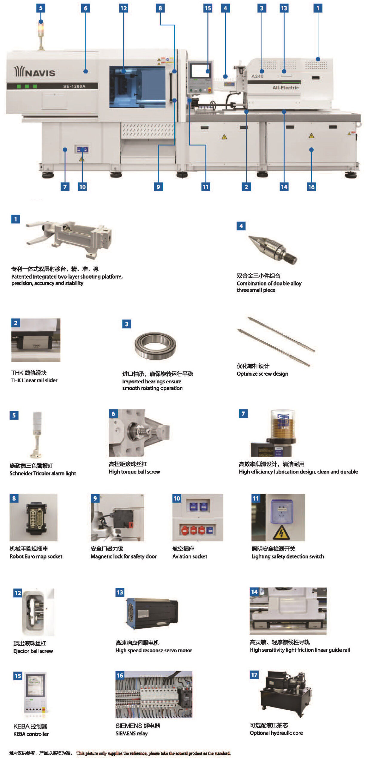 • Top responsibility servo motor and high torque ball screw is key element, origin Japan technology to keep advantage leading in the word, precise for mold movement.